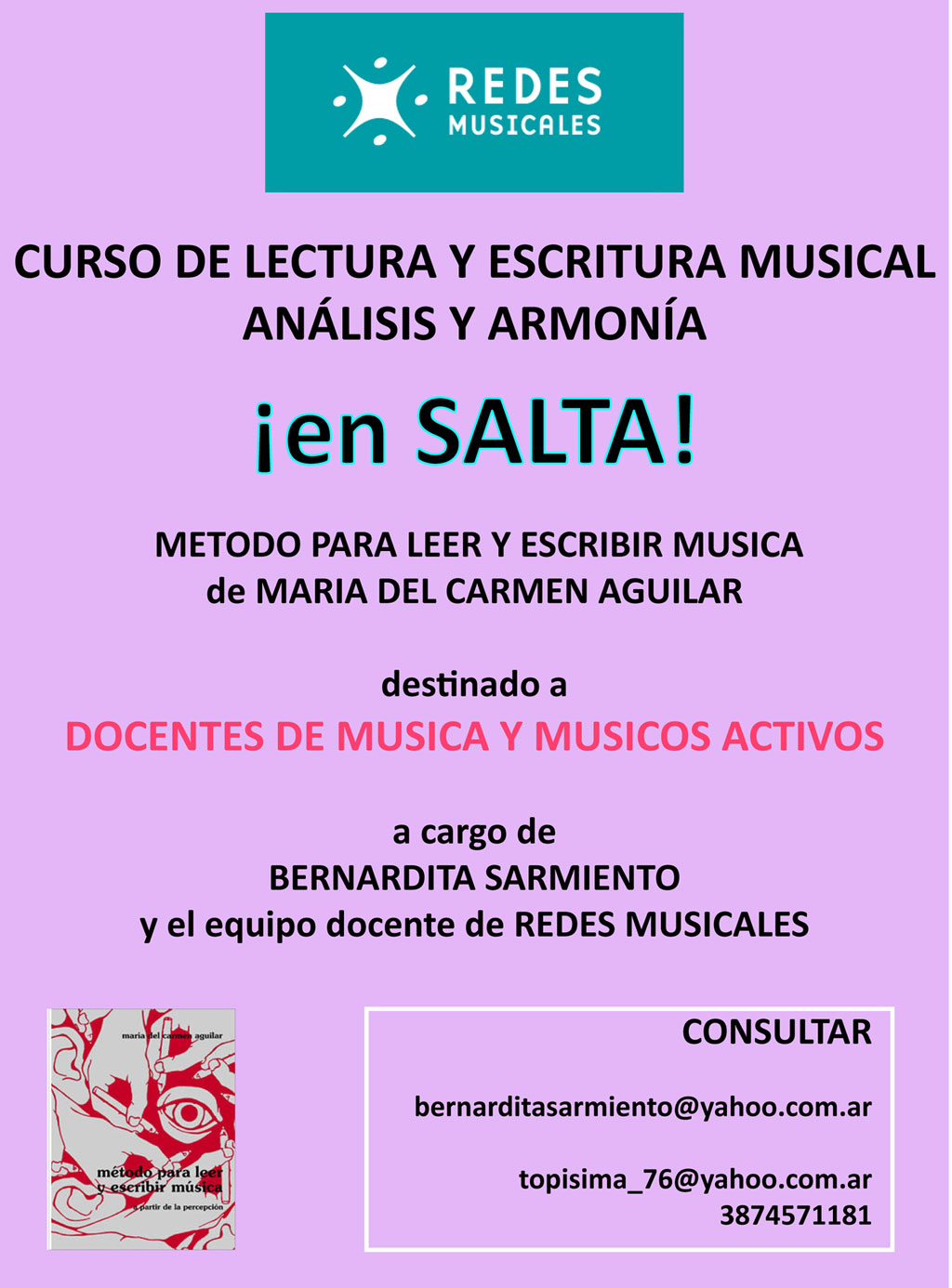Formación de un grupo de estudio de Lectoescritura Musical destinado a docentes y músicos activos de la ciudad de Salta y alrededores, capacitación a distancia de la profesora Bernardita Sarmiento quien tiene a su cargo el grupo y provisión de material didáctico.