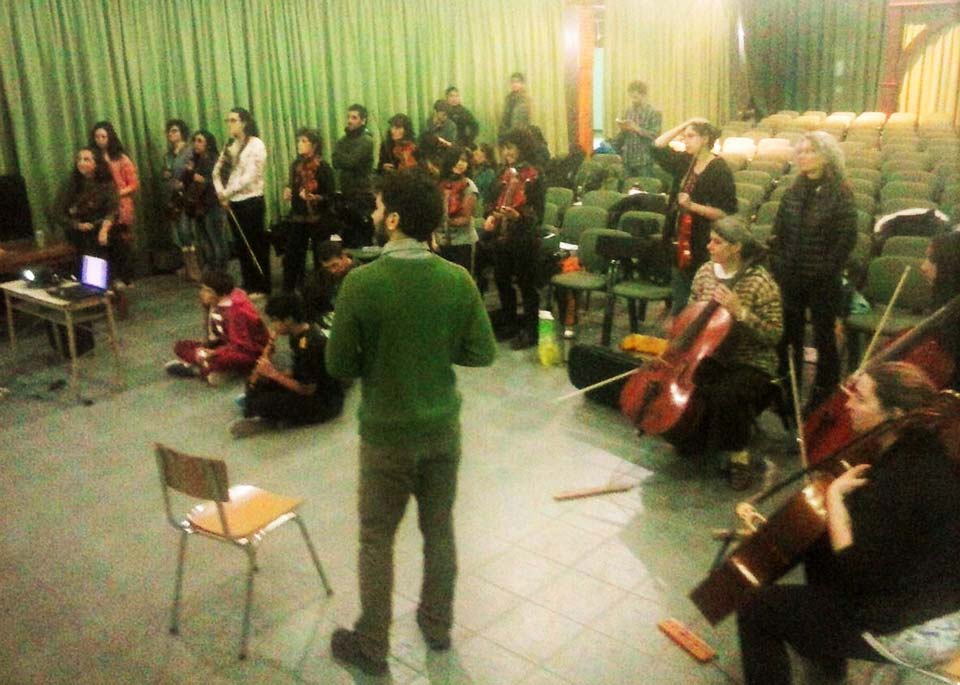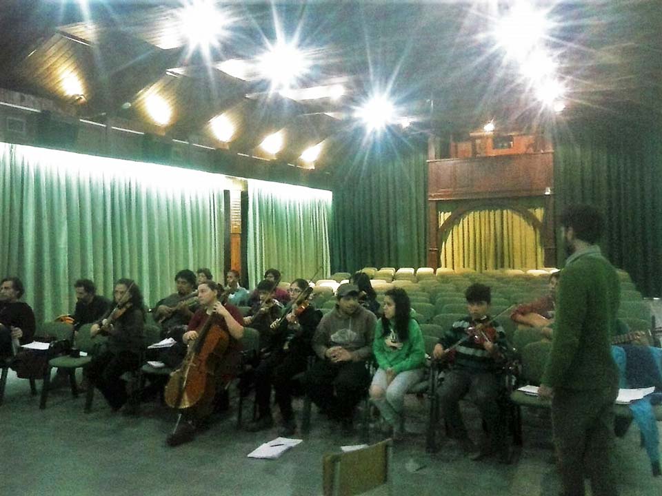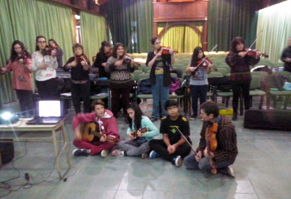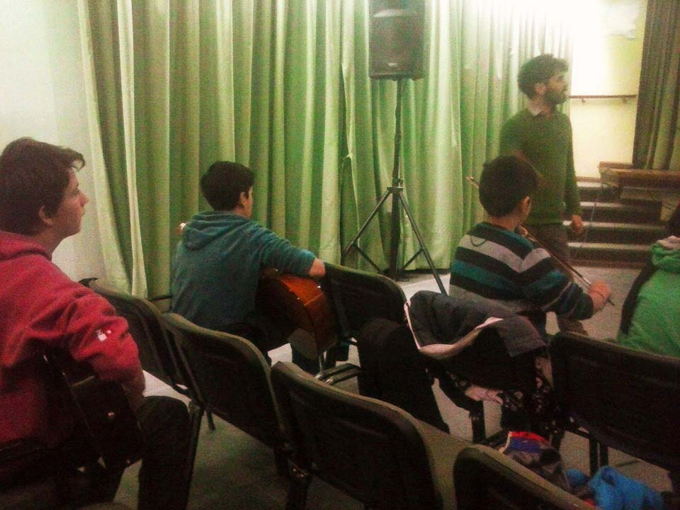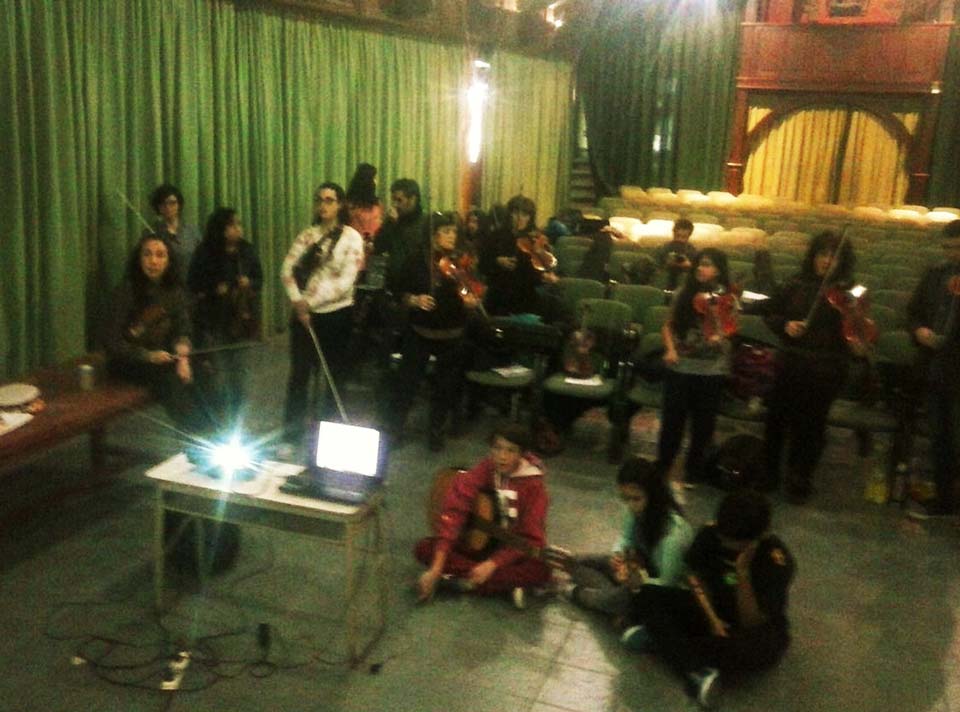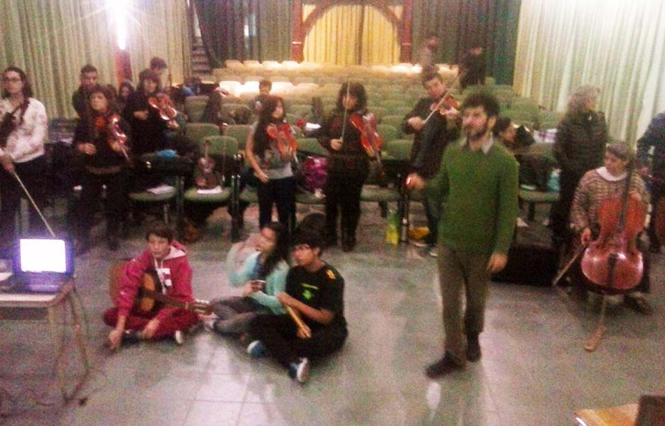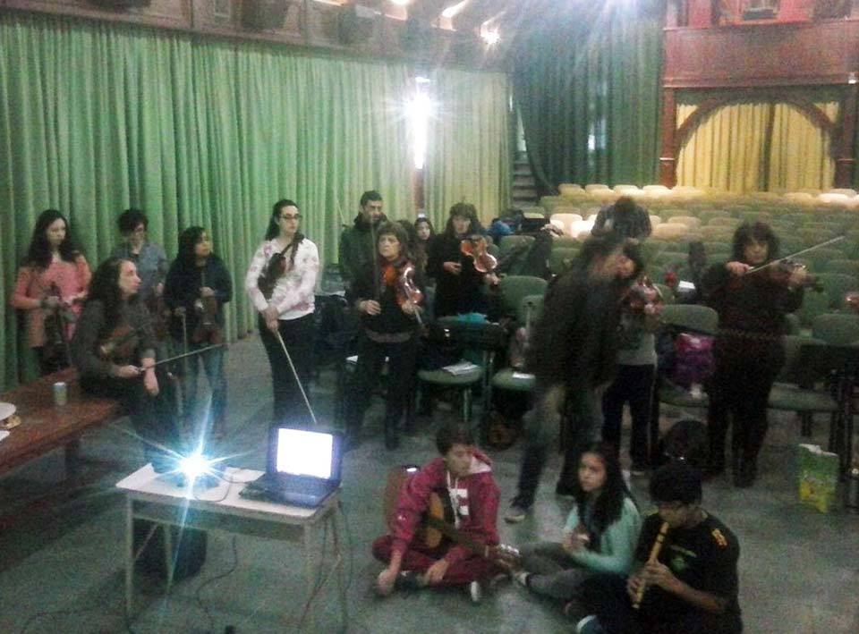 A) Segundo módulo del taller de Audioperceptiva y Armonía para integrantes de la orquesta Arcos de Trevelin, dirigida por Paz Misurelli, y la orquesta Pú Pichikeché de Esquel, del Programa Andrés Chazarreta, dirigida por Victor Nereo.