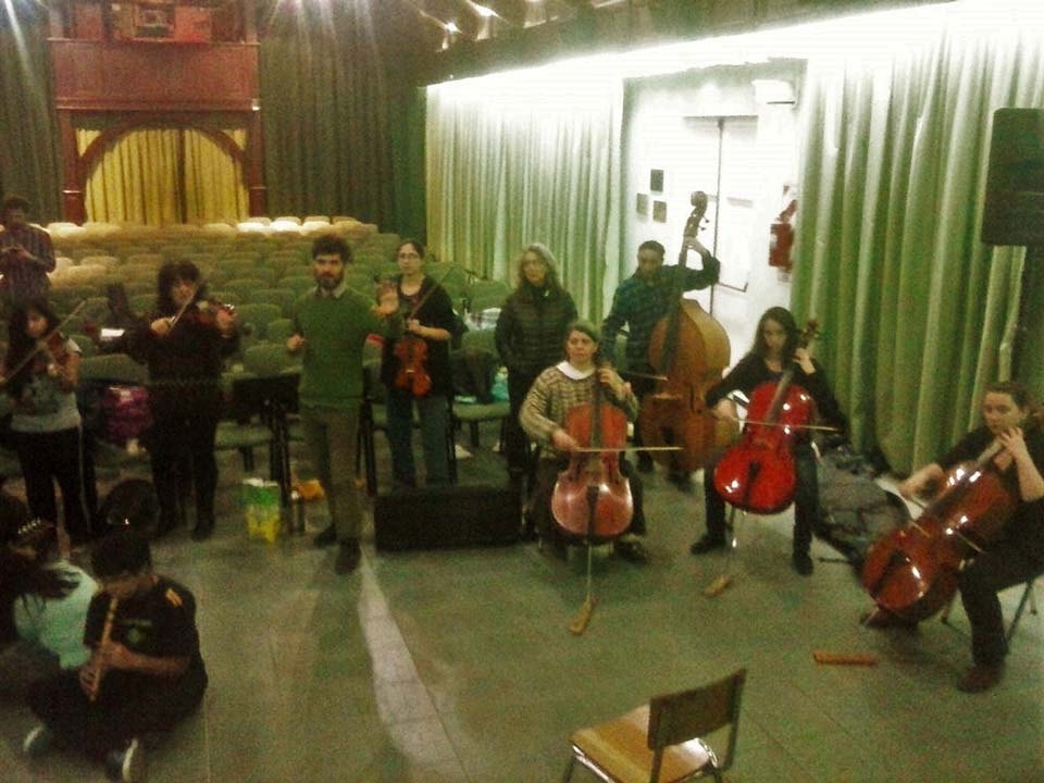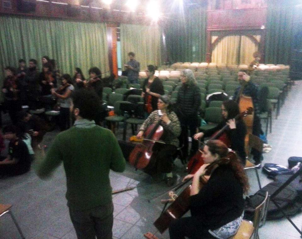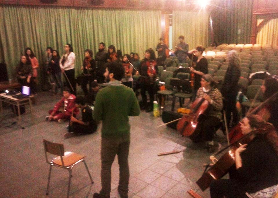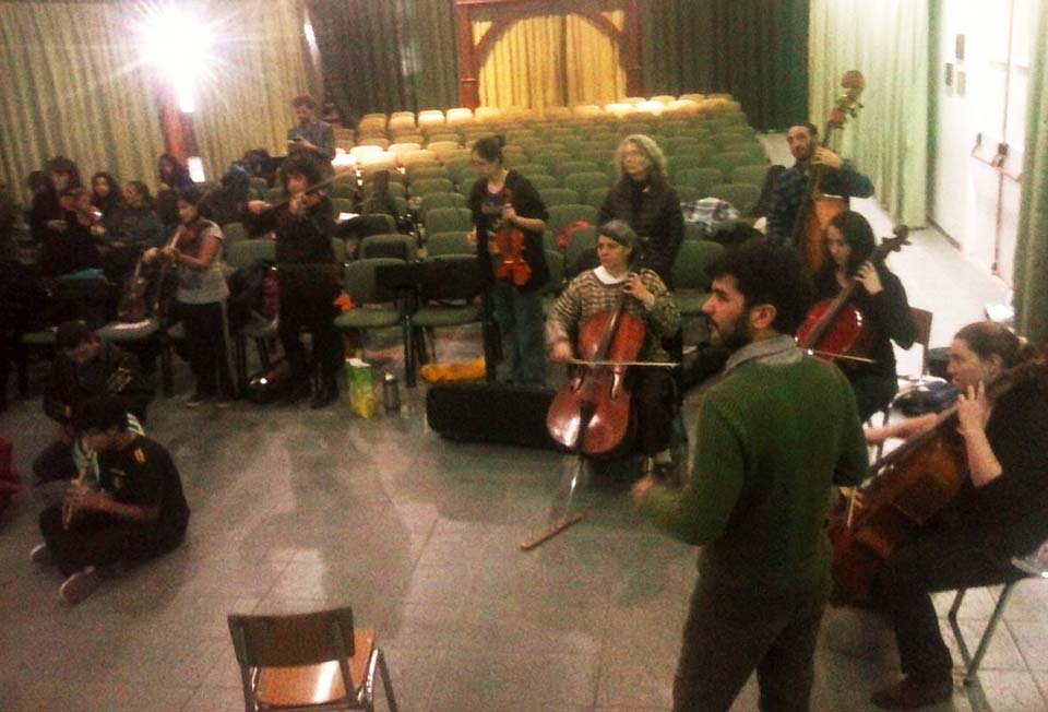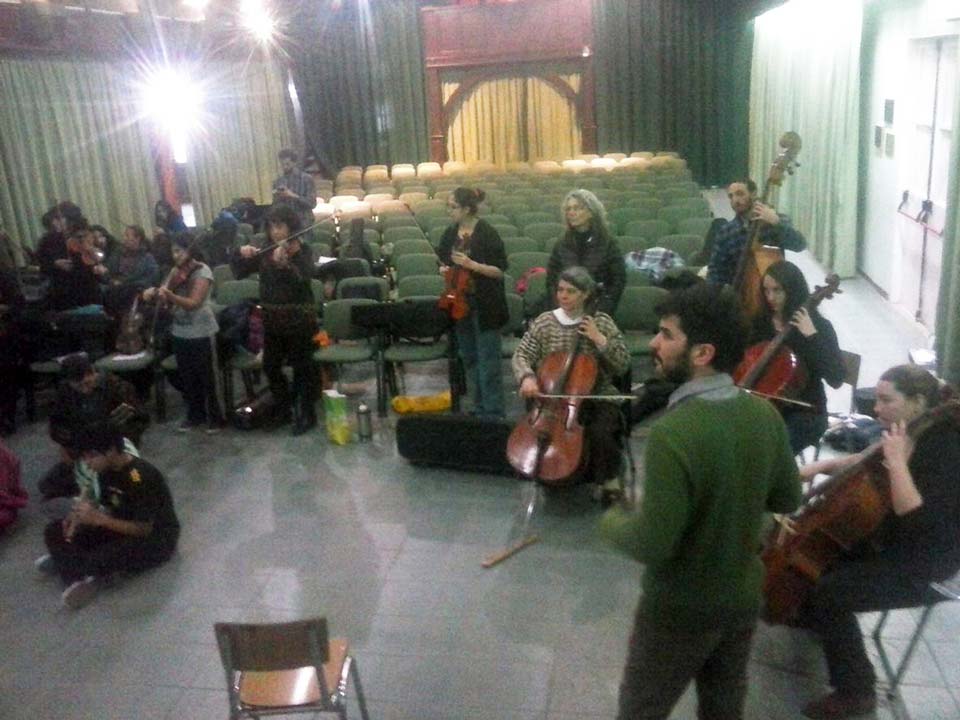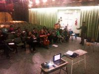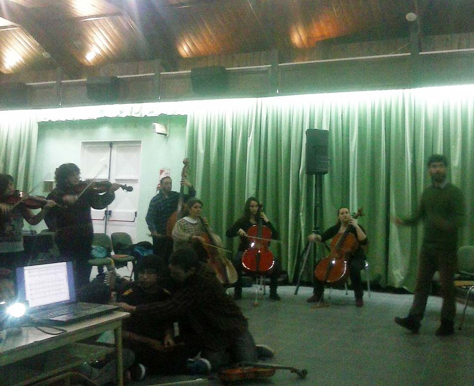 A) Segundo módulo del taller de Audioperceptiva y Armonía para integrantes de la orquesta Arcos de Trevelin, dirigida por Paz Misurelli, y la orquesta Pú Pichikeché de Esquel, del Programa Andrés Chazarreta, dirigida por Victor Nereo.